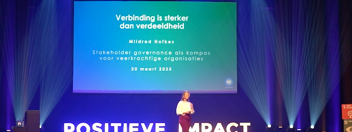 Mildred Hofkes inspireert met haar actuele verhaal over Stakeholder Governance en goed bestuur een zaal vol impactmakers tijdens het duurzaamheidsevent Positieve Impact op 20 maart 2025 in het Flint theater in Amersfoort.